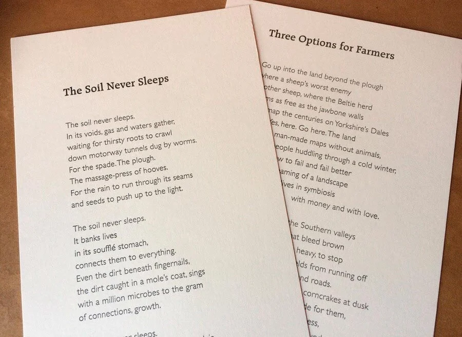 The aim of the residency was to concentrate the thoughts of the farmers at the conference into poetry and to write specifically about the soil. I spent a fascinating two days listening to them discussing the need to put the soil back central, finally writing two poems about the soil and the farmers’ relationship with it and the land as a whole.
